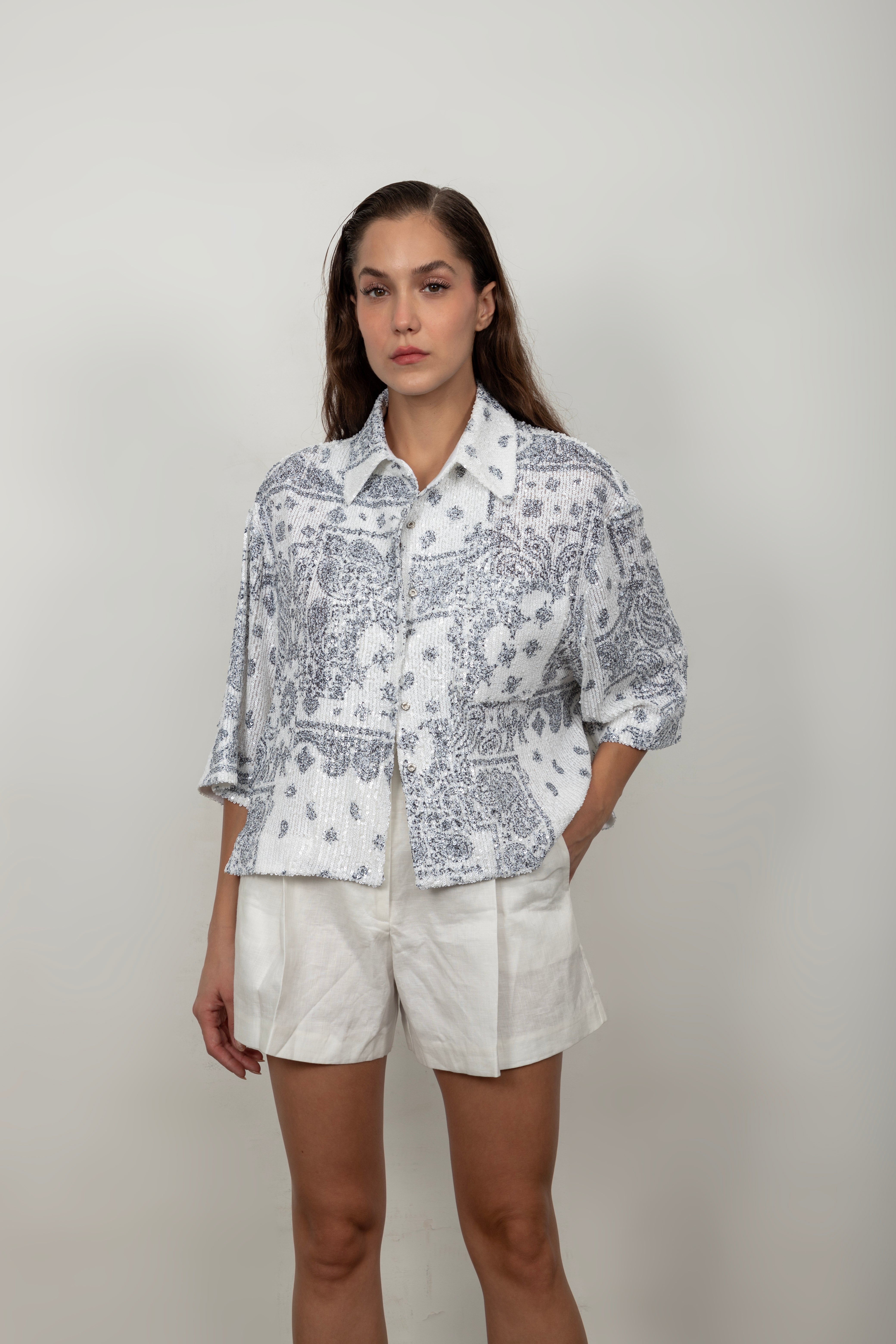 Bandana print sequin cropped shirt dress - details & care: dry clean only.